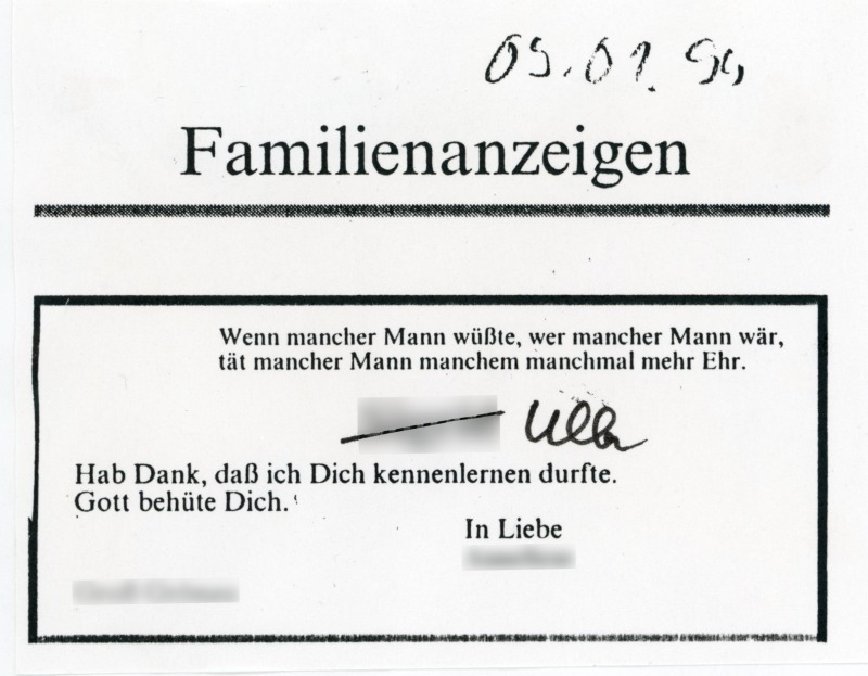 Vermutlich im Rahmen einer Schreibwerkstatt schreibt Gisela Al Amily in einer Art Brief an eine verstorbene Freundin ihre Gedanken zu einer Anzeige in einer norddeutschen Tageszeitung auf, die eine Frau 1999 vermutlich anlässlich des Todes einer anderen Frau aufgegeben hat.