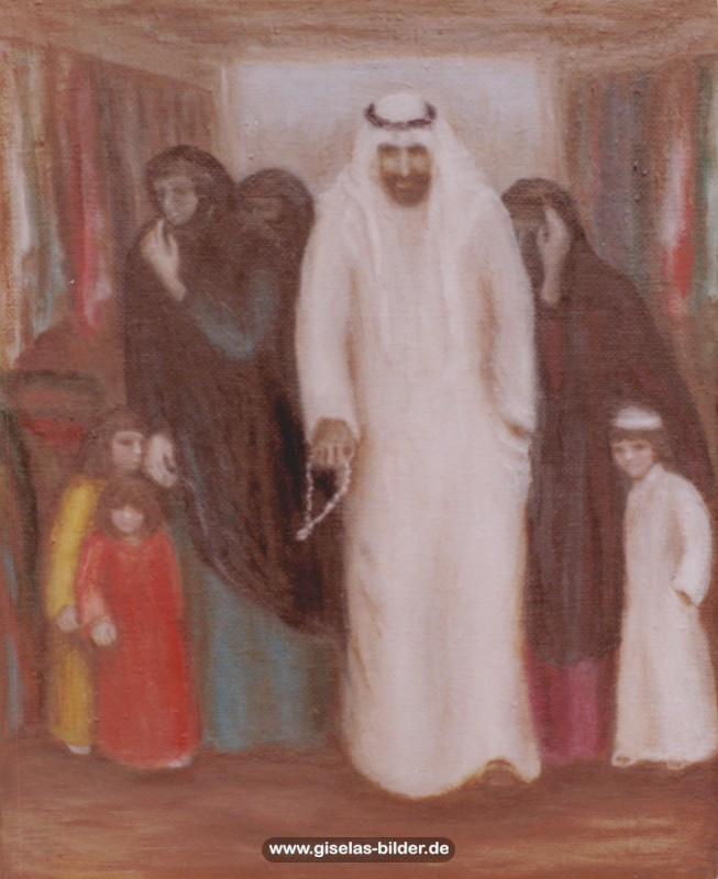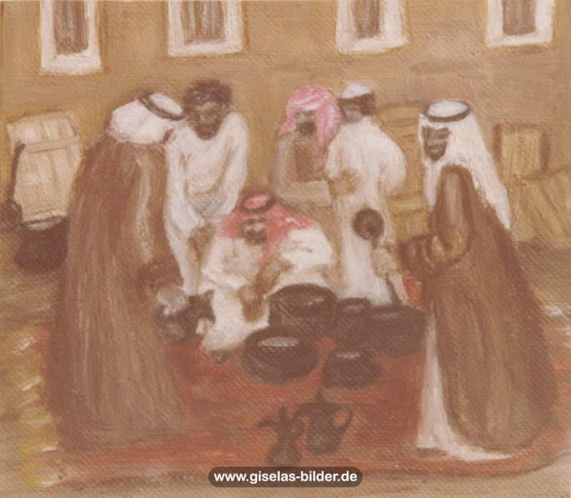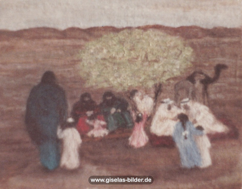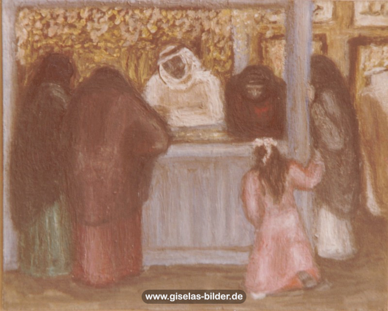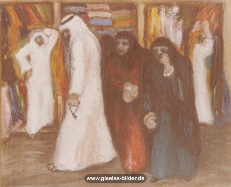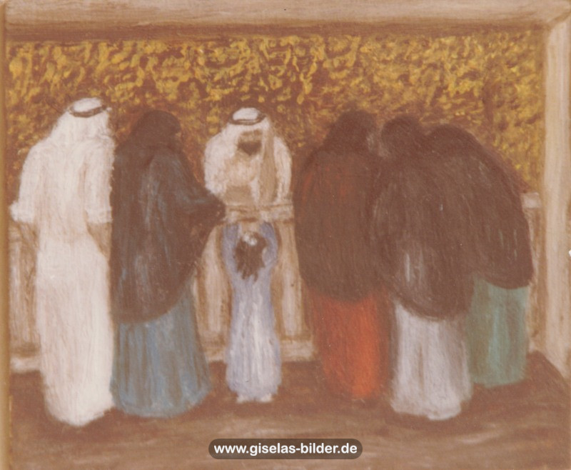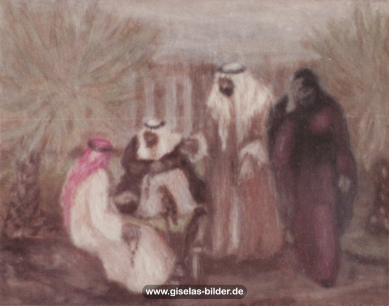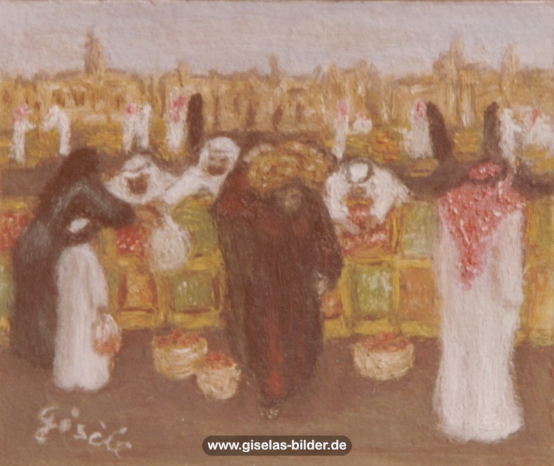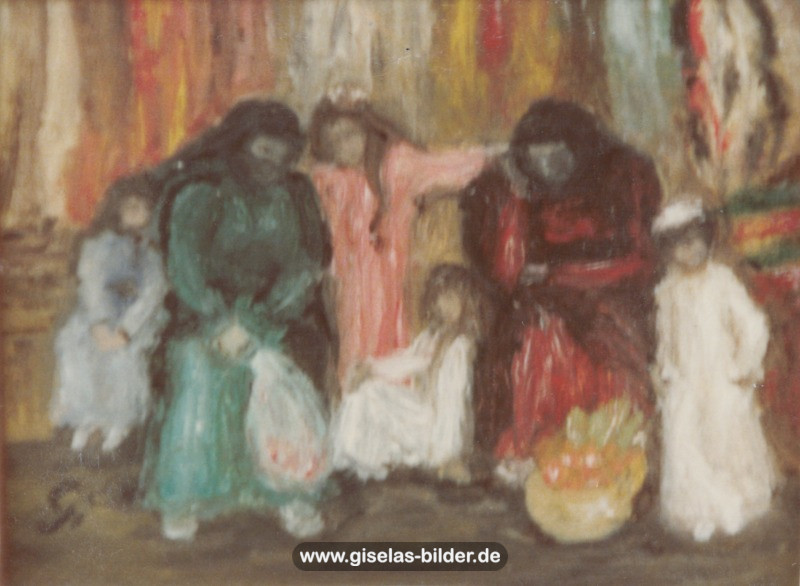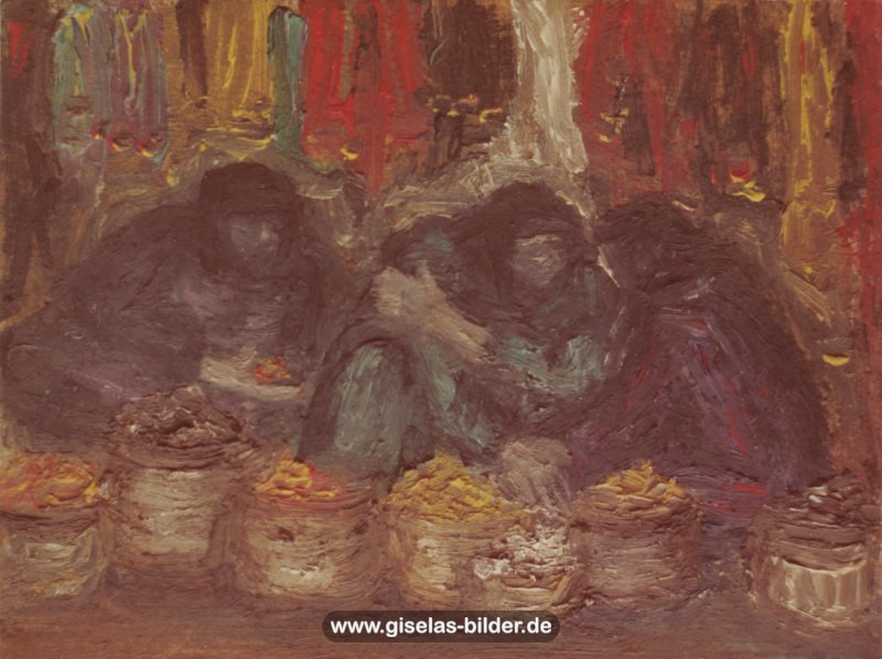 Eine Auswahl der Bilder aus der Riad-Periode, die alle das arabische Leben thematisieren, können Sie im Folgenden betrachten. Da die Künstlerin fast alle Werke aus dieser Zeit an ein internationales Publikum verkauft hat, handelt es sich in den meisten Fällen um Scans von ca. 40 Jahre alten, teilweise schon etwas verschwommenen und vergilbten Fotos.