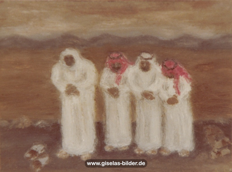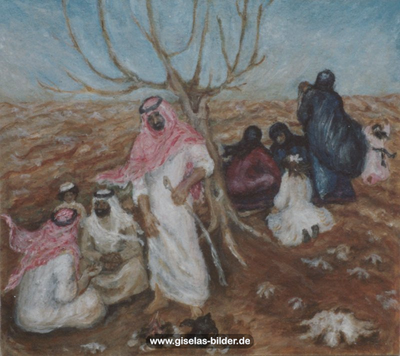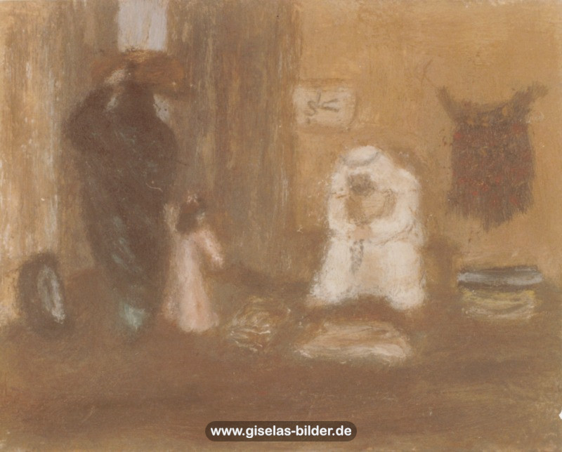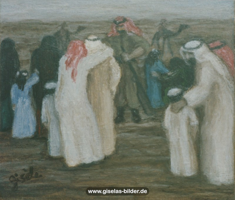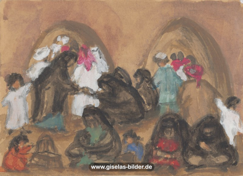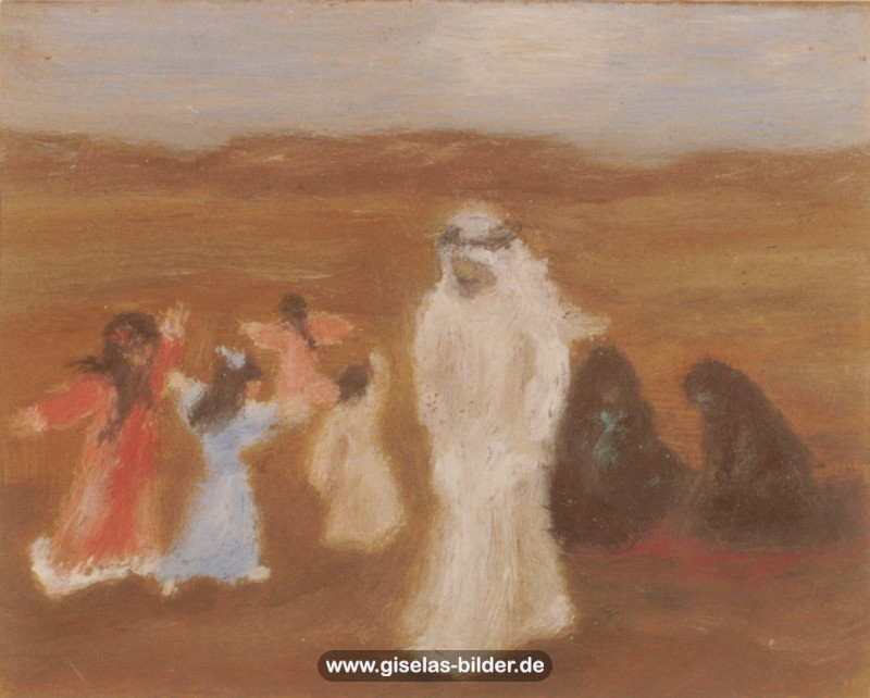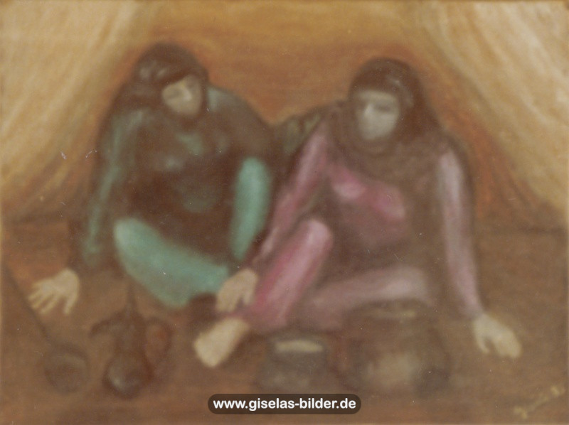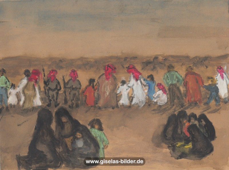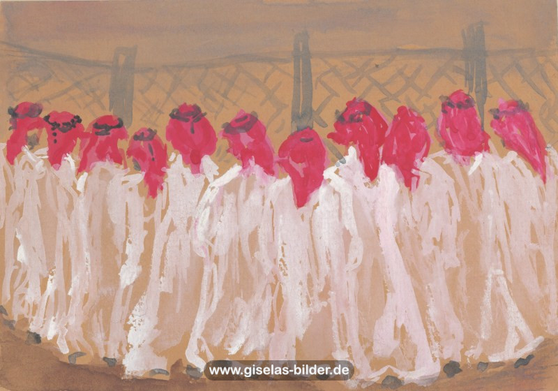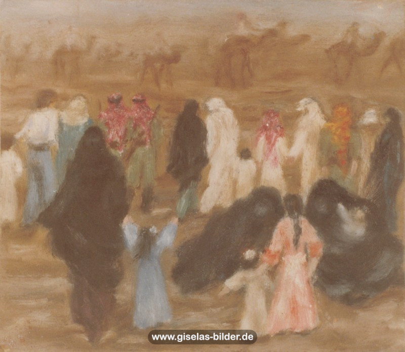 Eine Auswahl der Bilder aus der Riad-Periode, die alle das arabische Leben thematisieren, können Sie im Folgenden betrachten. Da die Künstlerin fast alle Werke aus dieser Zeit an ein internationales Publikum verkauft hat, handelt es sich in den meisten Fällen um Scans von ca. 40 Jahre alten, teilweise schon etwas verschwommenen und vergilbten Fotos.